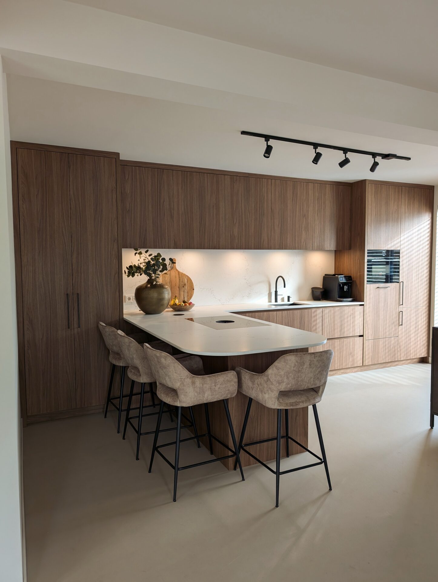 Greeploos, minimalistisch en strak. Een moderne maatwerk keuken van Volmaak kenmerkt zich door rustige kleuren zoals zwart, beige of taupe, dunne werkbladen en strakke lijnen zonder poespas. Populair bij nieuwbouwwoningen en design-georiënteerde klanten die rust en overzicht willen in hun keuken.