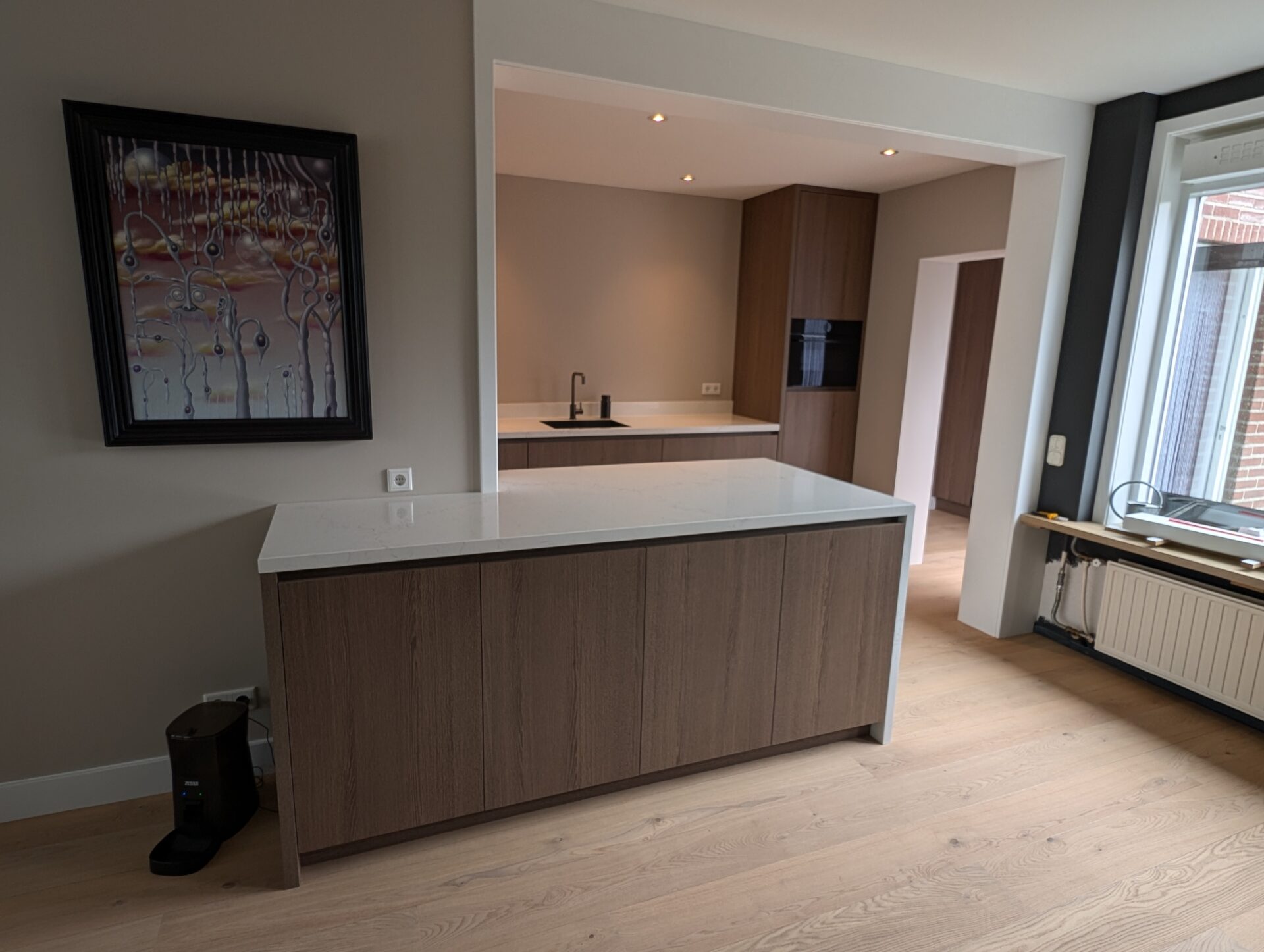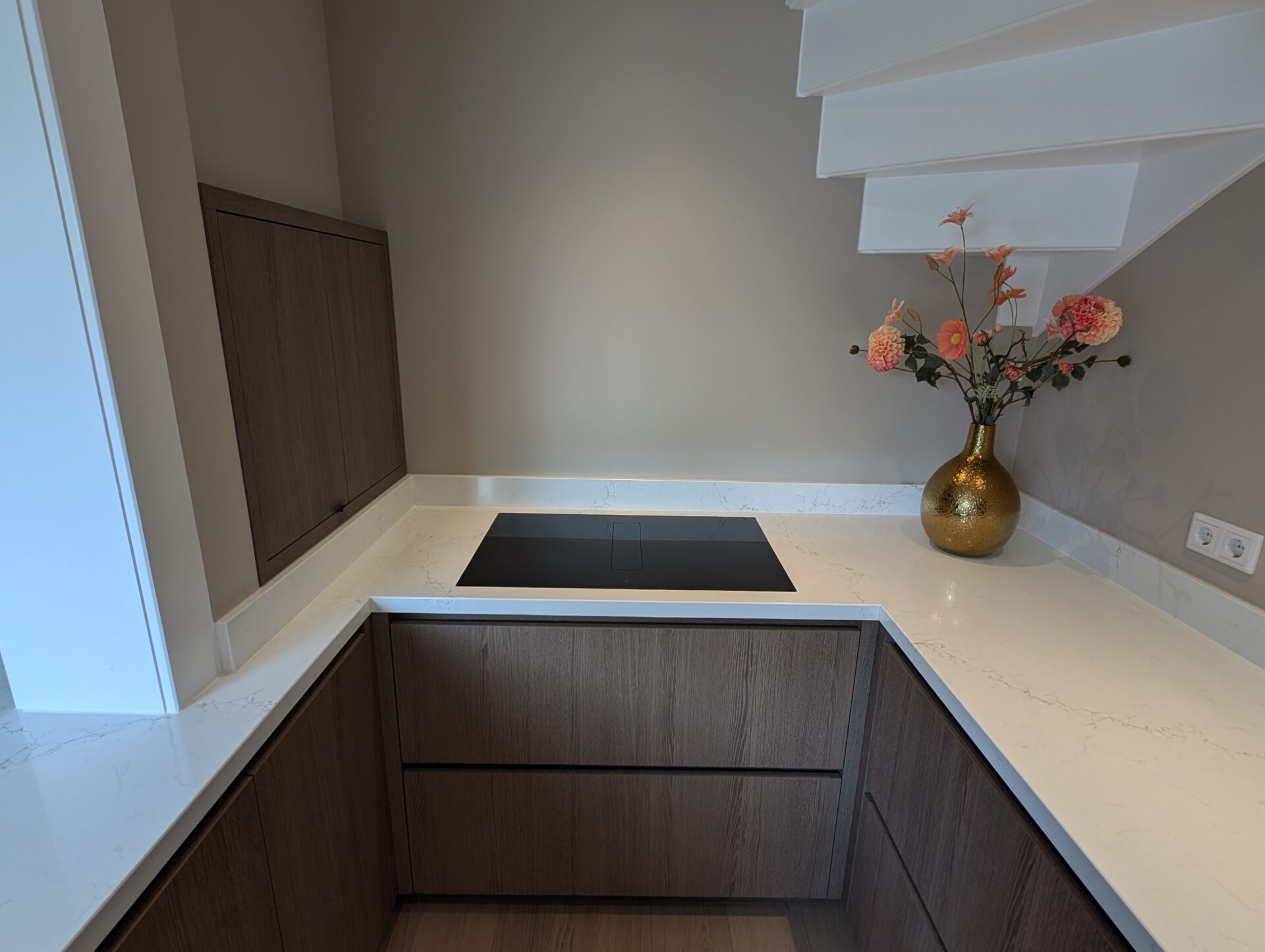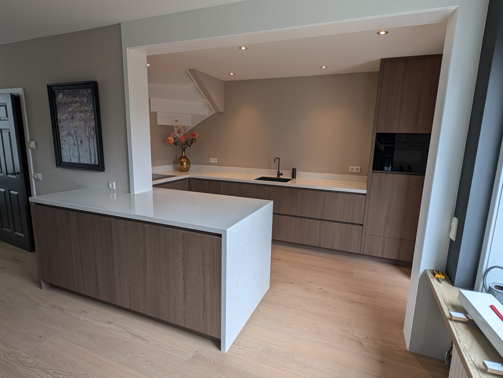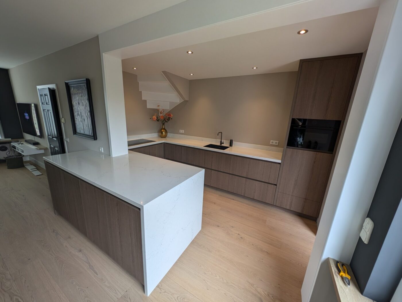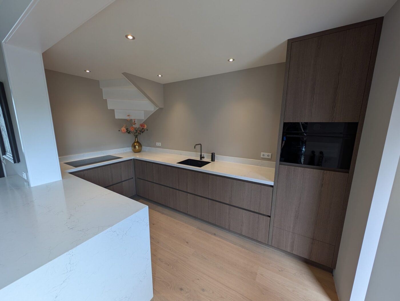Deze op maat gemaakte keuken en bijkeuken zijn uitgevoerd in donker eikenhout met een wit composiet blad dat in verstek tot de grond doorloopt. De combinatie van warme houttinten en het strakke witte blad zorgt voor een modern en tijdloos geheel. Alles is met oog voor detail en vakmanschap op maat gemaakt voor een perfecte afwerking.