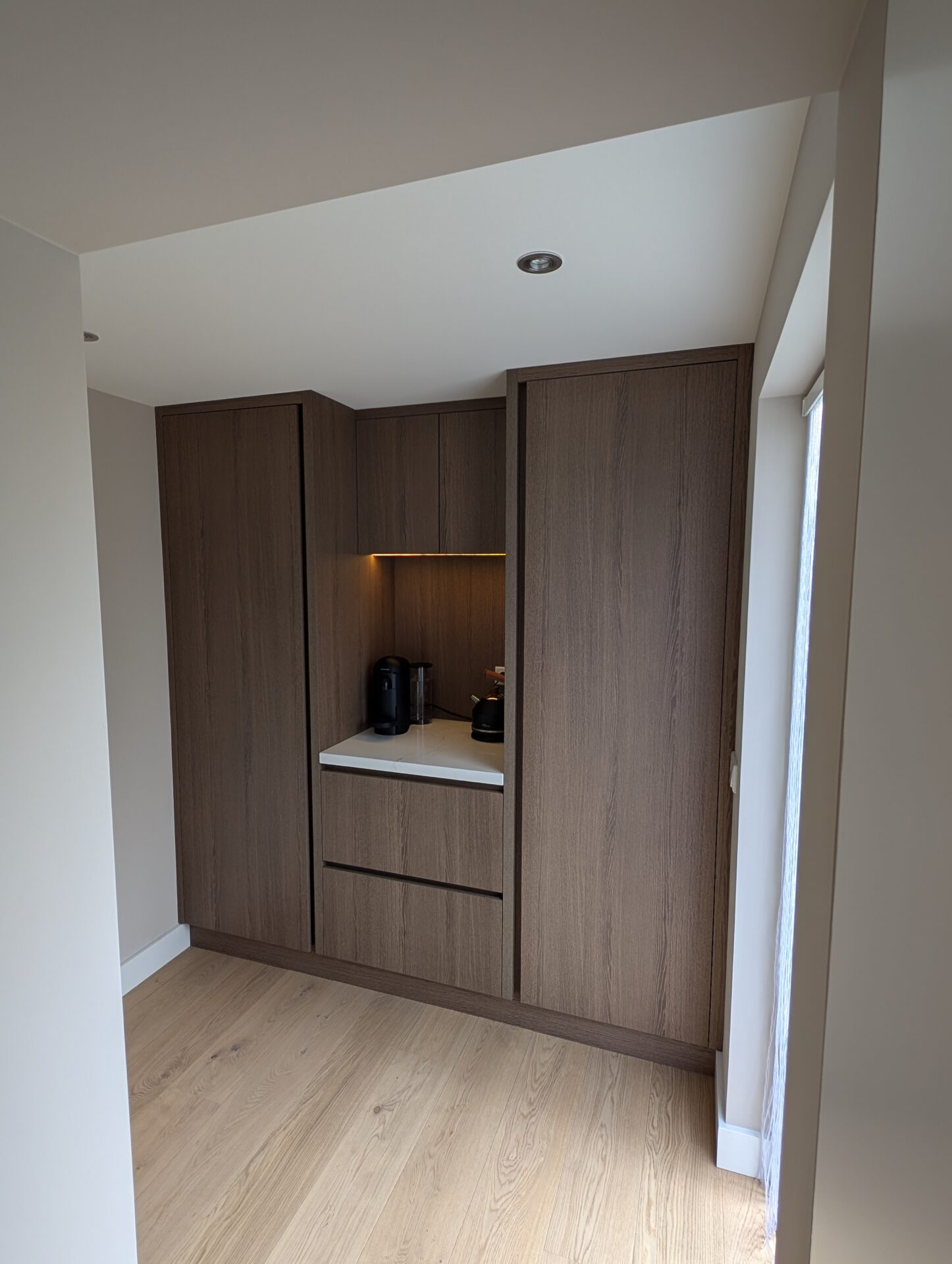 Een keuken die warmte uitstraalt zonder zijn strakheid te verliezen, dat was de wens bij dit project. Volmaak realiseerde een complete maatwerk keuken én bijkeuken in donker eikenhout, afgewerkt met een wit composiet werkblad dat in verstek tot de grond doorloopt. De combinatie van warme houttinten en de strakke witte lijn geeft het geheel een modern en tegelijk tijdloos karakter.