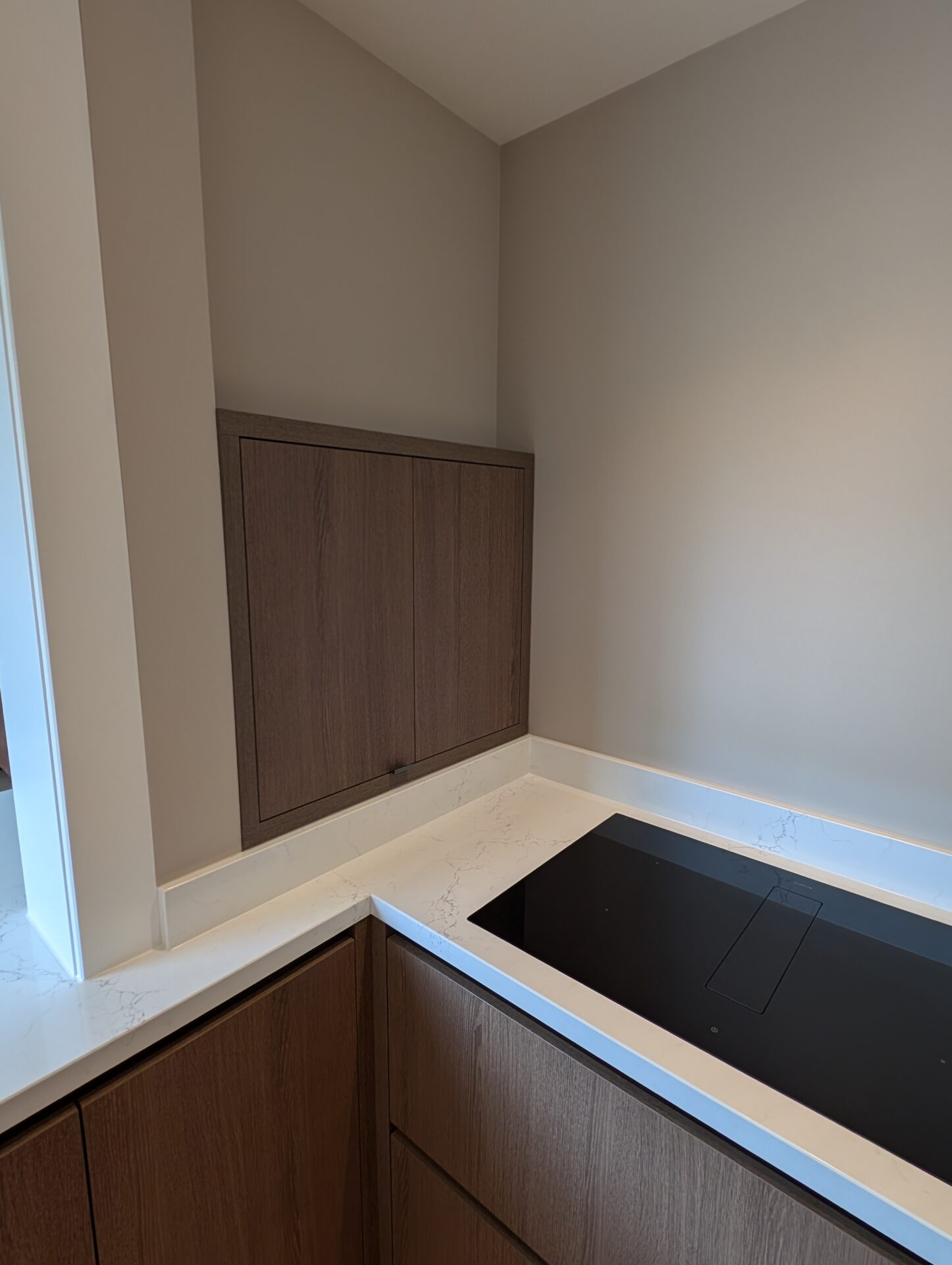 Het composiet werkblad loopt in verstek tot aan de vloer, een keuze die de keuken een strakke, bijna sculpturale uitstraling geeft. Gecombineerd met het warme donkere eikenhout ontstaat er een contrast dat zowel stoer als verfijnd aanvoelt.