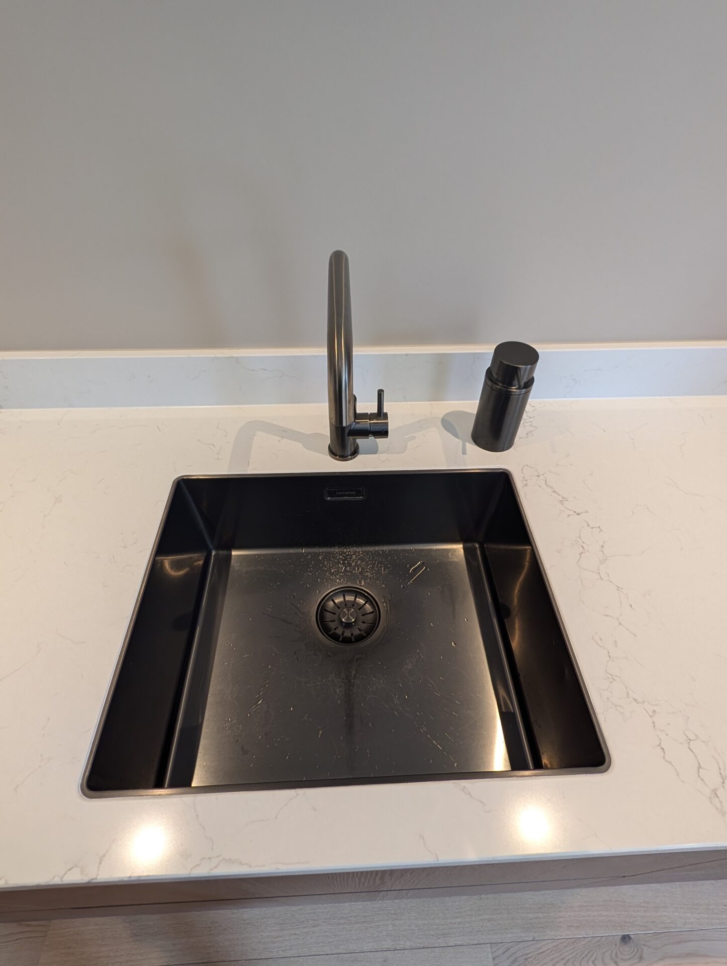 - Wit composiet werkblad met verstekafwerking tot de vloer