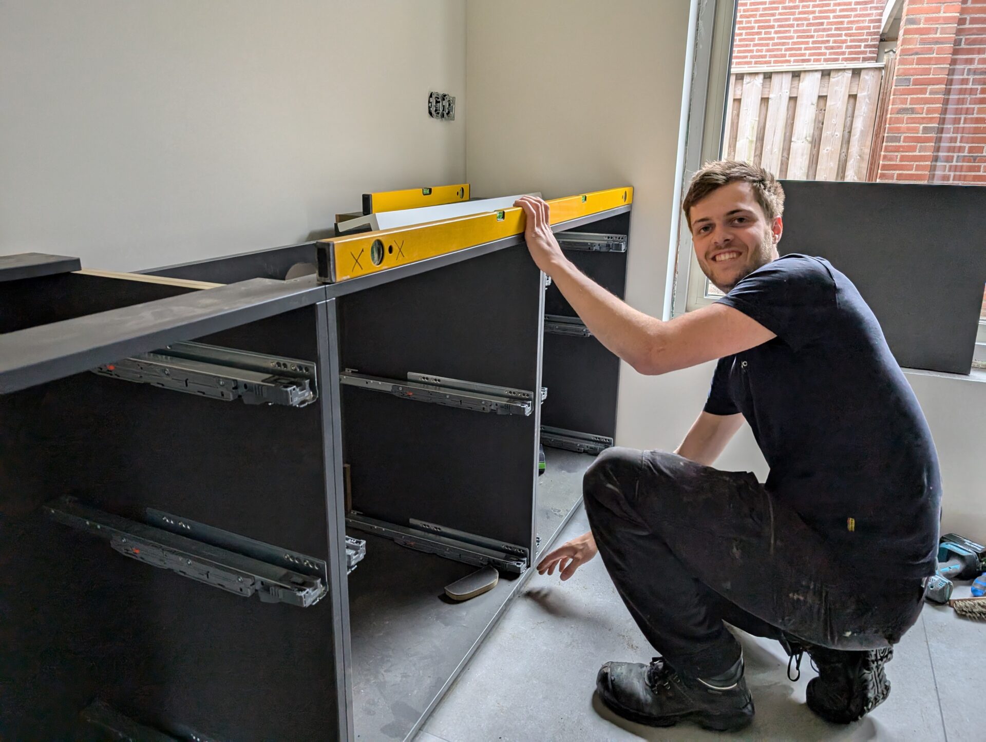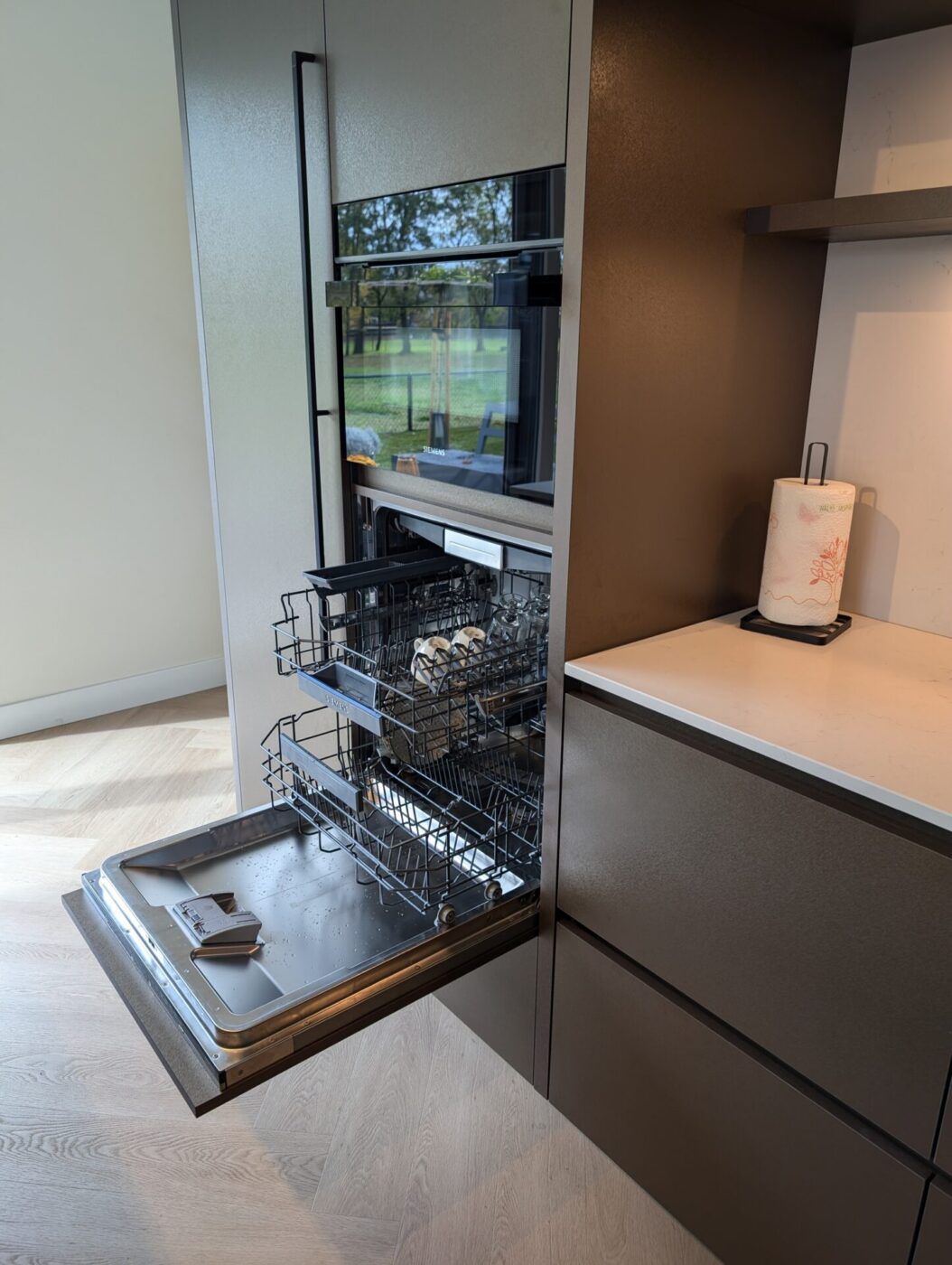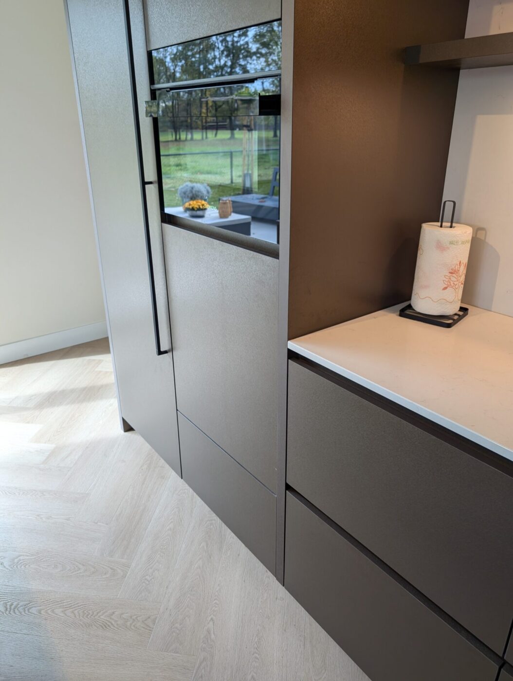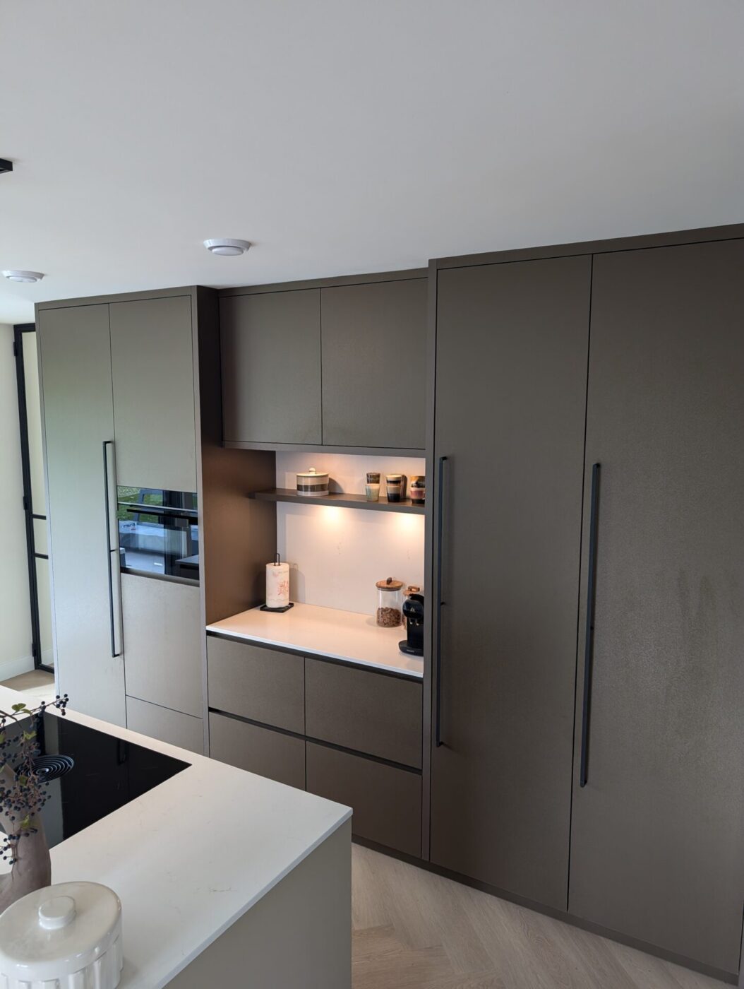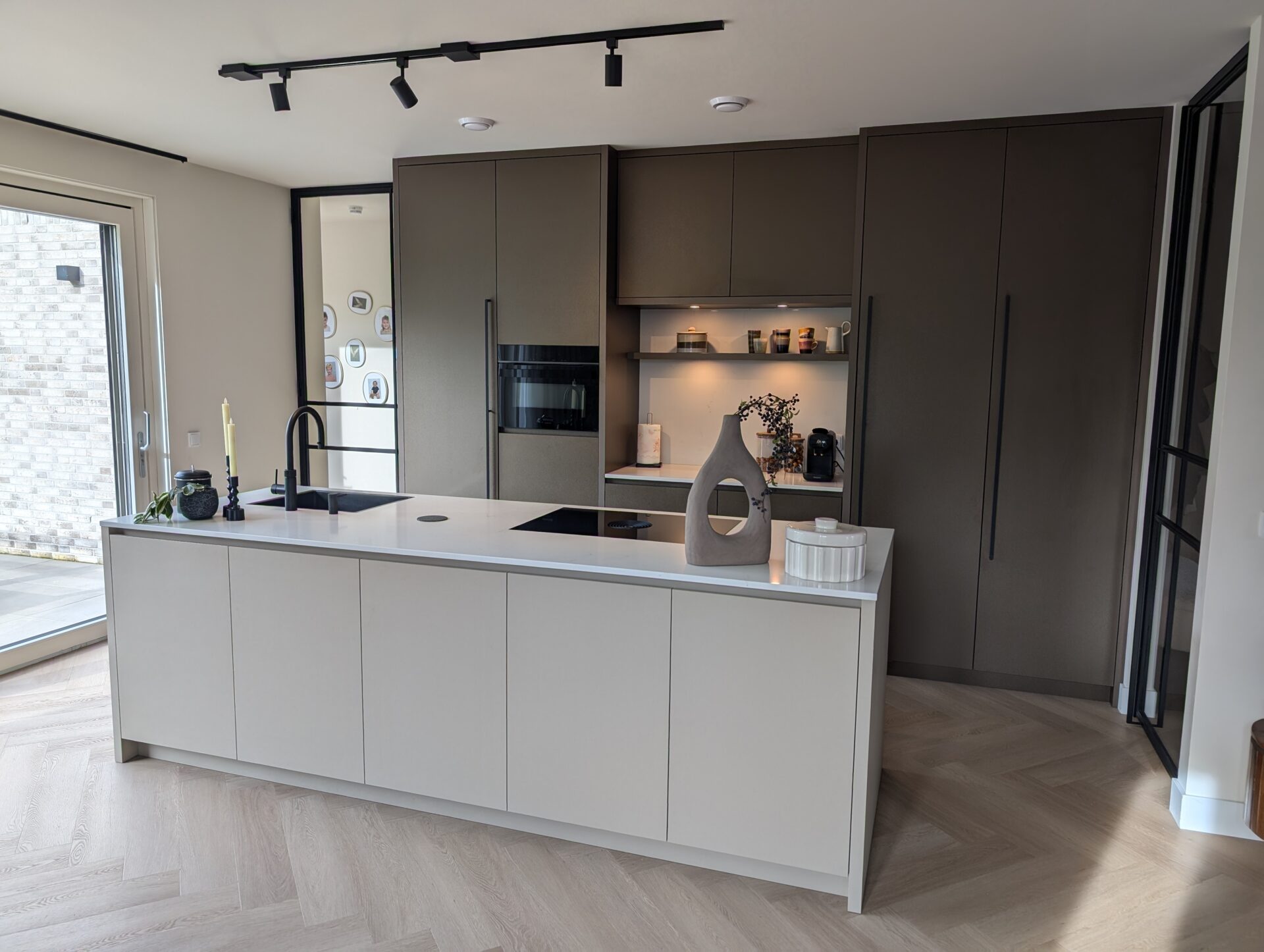Een stijlvolle combinatie van de Decolegno collectie en een hoge kastenwand op maat tot het plafond, afgewerkt met LED-verlichting. Het ruime eiland met wit werkblad en warme tinten zorgt voor een perfecte balans tussen modern design en een sfeervolle uitstraling.
