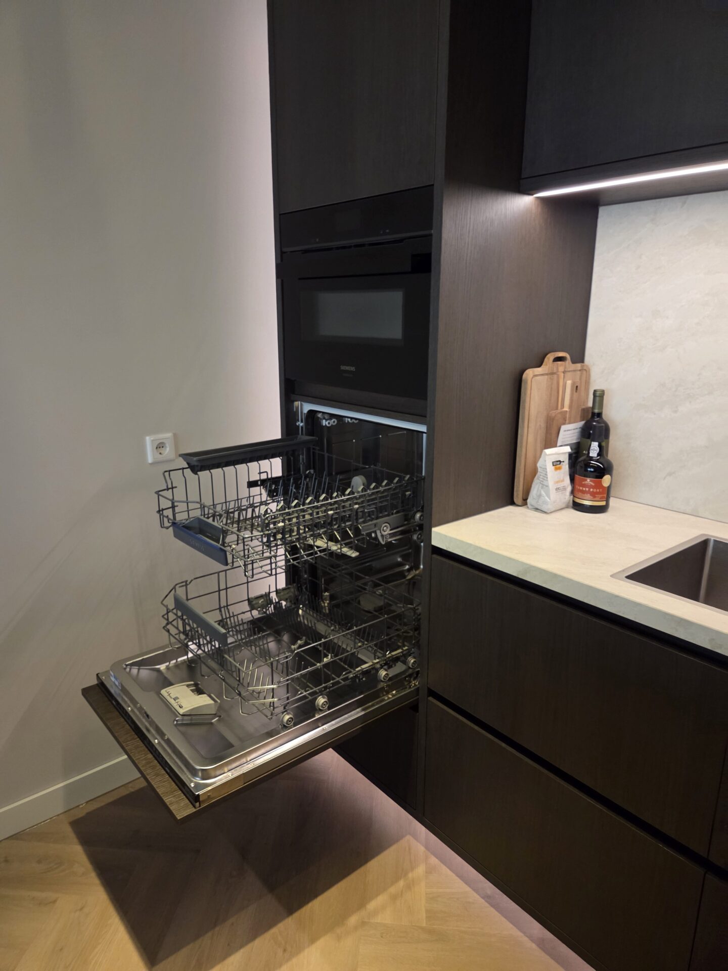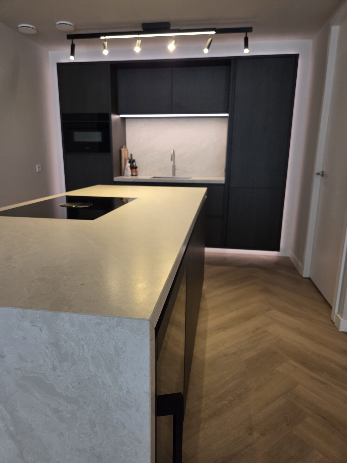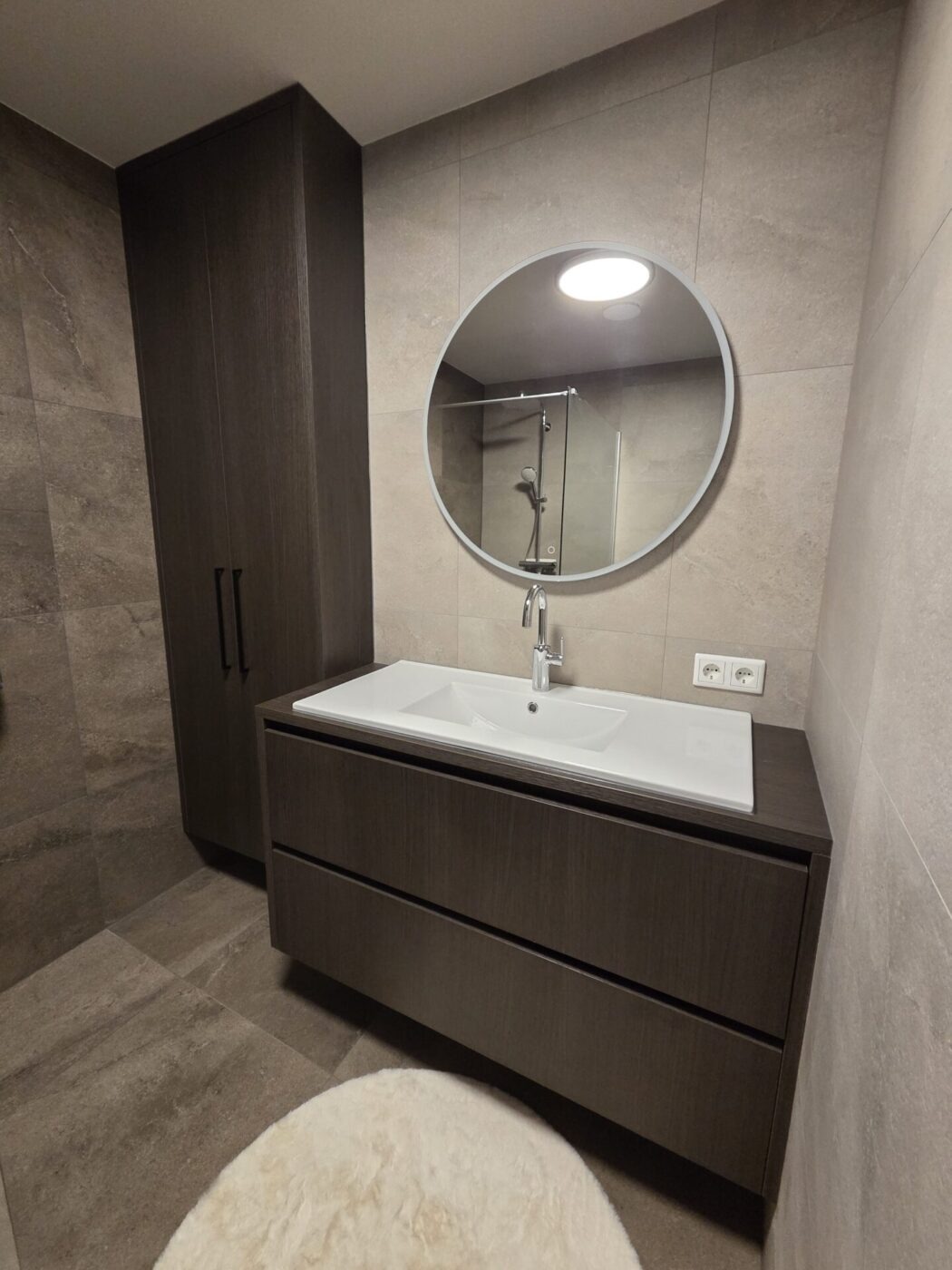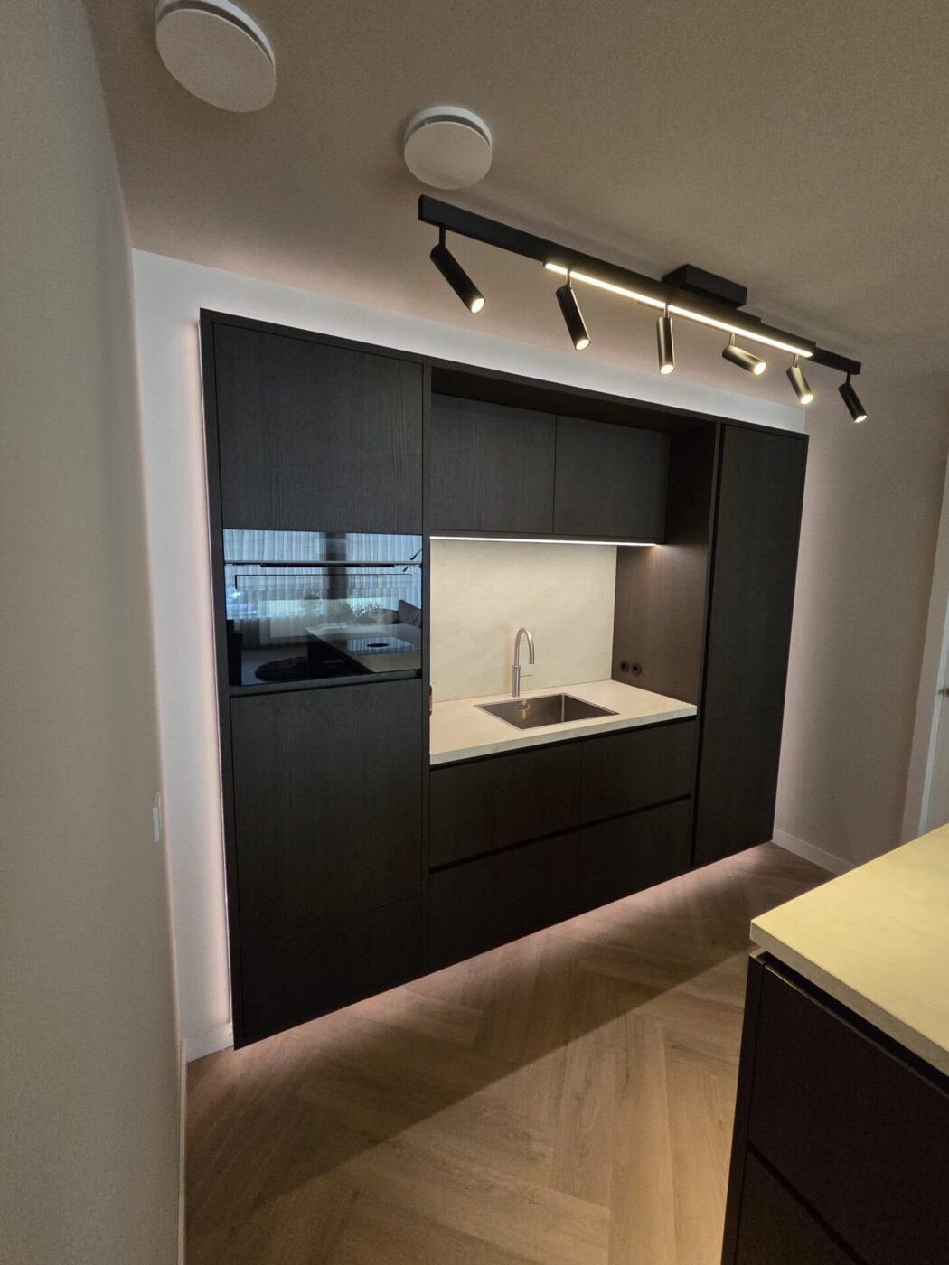 Een standaard keuken past zelden perfect in de ruimte. En een kast uit de winkel matcht nooit precies met de rest van het interieur. Bij dit project werd elk onderdeel op exact maat gemaakt — de keuken sluit aan op de wanden, de kasten lopen door tot het plafond en het badkamermeubel past millimeterprecies in de nis. Dat is het verschil tussen kopen en laten maken.