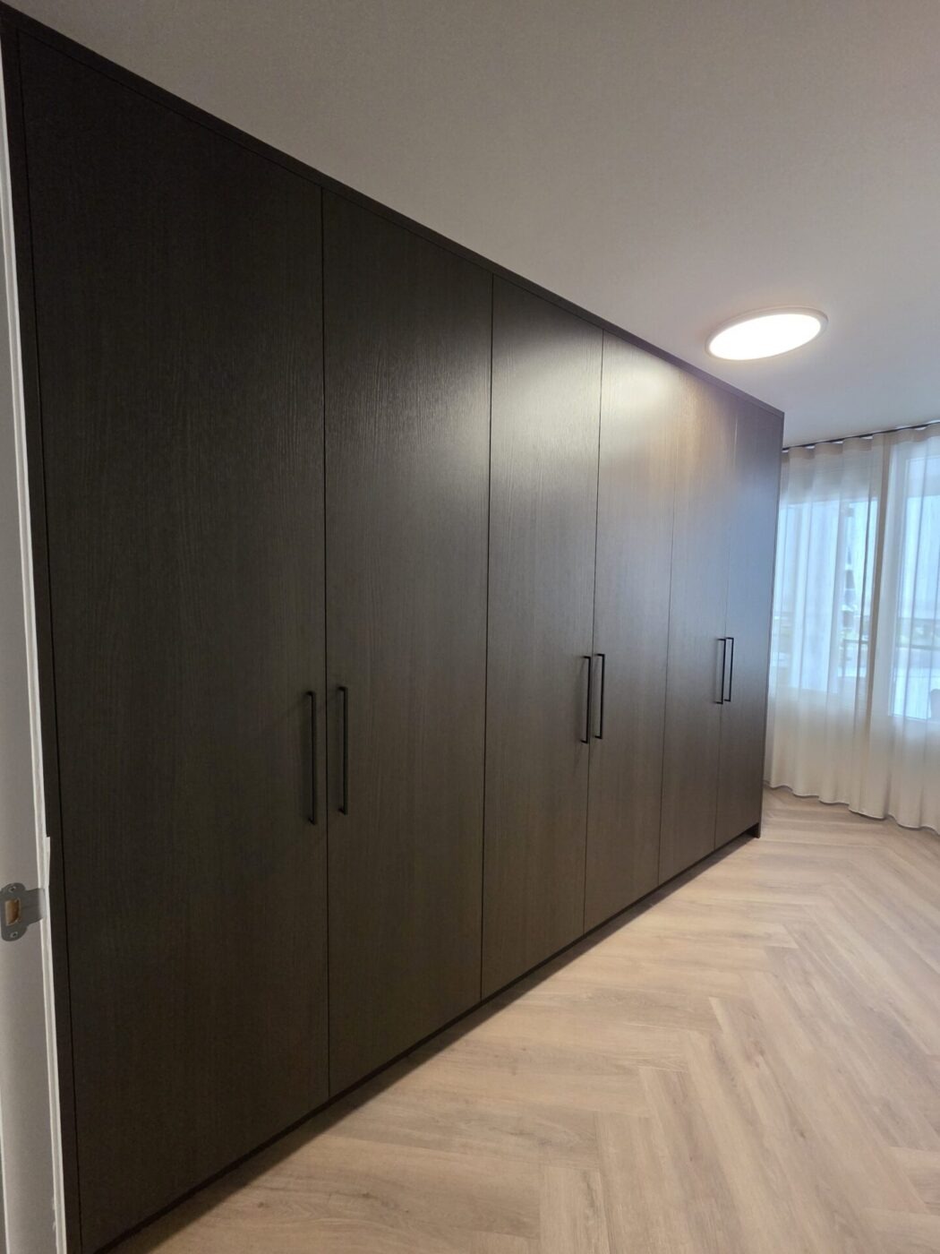 Wanneer je een volledig interieur laat maken, wil je dat alles klopt, van de keuken tot de slaapkamer. Dat was precies de opdracht bij dit project. Volmaak realiseerde een complete maatwerk woning interieur in warm bruin eikenhout: een strakke keuken met natuurstenen werkblad en geïntegreerde wijnkoeler, vloerhoge slaapkamerkasten, een maatwerk wandkast voor de woonkamer én een badkamermeubel op maat, alles in dezelfde rustige, tijdloze stijl.